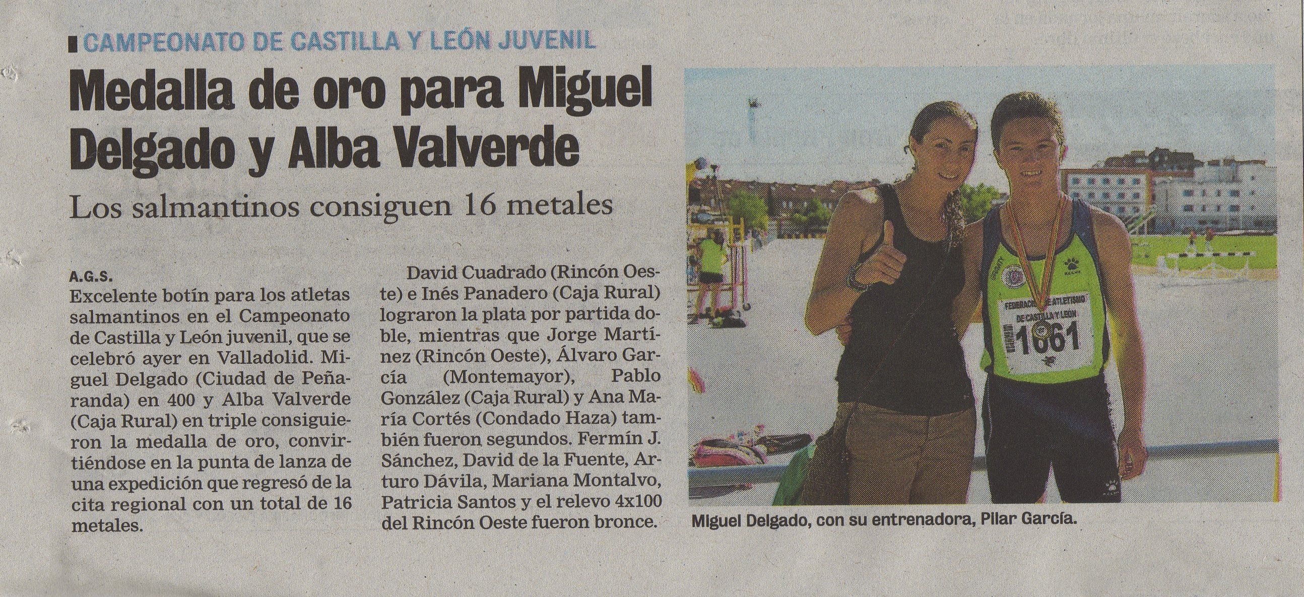 En el Campeonato Autonómico Juvenil en Pista al Aire Libre en las Pistas de Río Esgueva en Valladolid, nuestro Atleta Miguel Delgado, demostró en su primer año en la Categoría Juvenil que es un Atleta grande y en desarrollo, ya que se proclamó CAMPEON Autonómico Juvenil en la prueba de 400ml realizando una marca de 50.58, cerca de su Mejor Marca Personal. La salida de tacos no fue muy buena, ya que Miguel tardó en arrancar, pero mejorando a partir del 300 la velocidad terminando el último 100 muy fuerte.