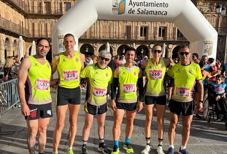 Ayer domingo día 09 de noviembre, tuvo lugar en un espléndido día soleado y con temperatura agradable, con salida y llegada en la Plaza Mayor de Salamanca, disfrutando también de las calles del centro y monumentos como la Casa de las Conchas, Fachada de la Universidad, Puente Romano, la Catedral y algunos más, la 8ª Carrera Popular Contra la Violencia de Género, donde varios Atletas de nuestro Club pudieron realizar un recorrido de 10km algo duro por los continuos cambios de desnivel y de terreno, con una exigente subida en el tramo final, para hacer estragos en los cuádriceps de los corredores.